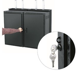 Front mounted latch saves valuable wall space by allowing wall racks to be placed side-by-side, in a corner, or wherever side clearance is an issue. To open, simply pull the convenient front-mounted handle. Unlike time-consuming threaded rods, this unique latch provides keylocked security from the front (keyed differently from optional front door). Easy to install; required for seismic installations